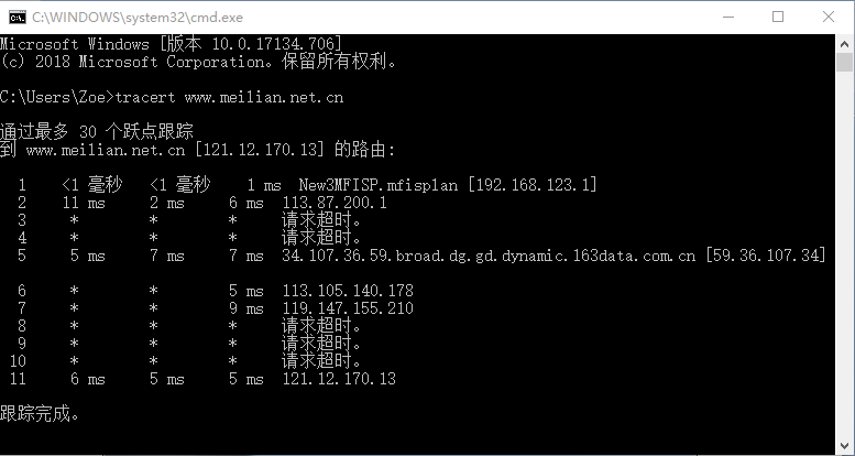 從圖1中可以看出,從本地主機到m.jimoerzhong.com這臺主機共經(jīng)過11個路由器轉(zhuǎn)發(fā)才最終到達目的地,并且成功解析121.12.170.13地址的主機名,而且從返回的結(jié)果中可以看出,數(shù)據(jù)包從本地發(fā)出后經(jīng)過的第一個路由地址為192.168.123.1,這是本地主機所屬網(wǎng)絡的外網(wǎng)中,第一個路由服務器地址。1、Tracert工作原理