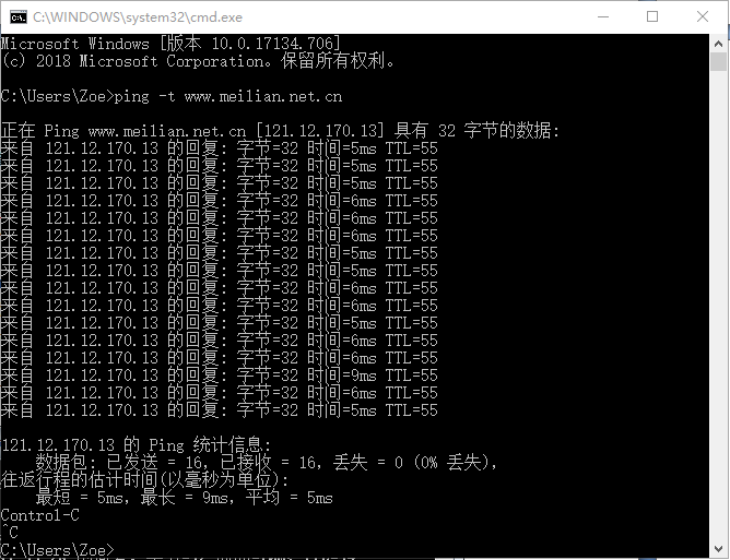 例美國服務器使用“-t”參數持續對主機www.meilian.net發送ICMP數據包命令執行情況如圖3所示: