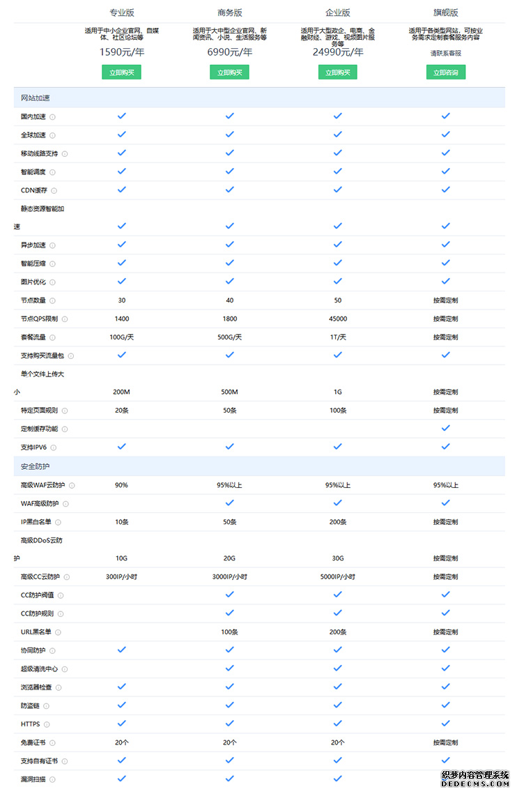 | 產品類型 | 適用網站 | CDN節點 | 套餐流量 | CC防護 | DDoS防護 | SEO更新同步 | 客戶支持 | SLA可用性 | 價格 |