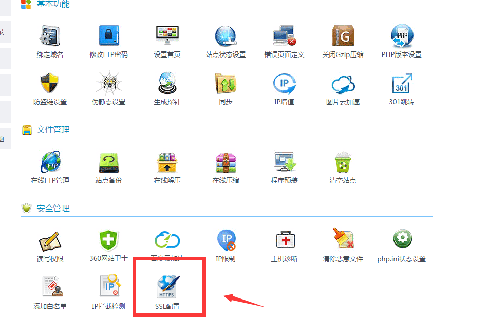 2、 登陸虛擬主機(jī)的自助管理平臺,找到自助管理平臺的安全管理,里面有個(gè)<SSL配置>選項(xiàng)。