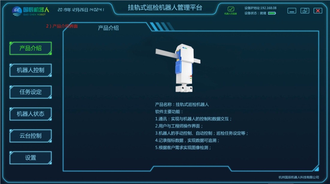 項(xiàng)目主要由移動(dòng)機(jī)器人本體、軌道系統(tǒng)、采集設(shè)備、定位系統(tǒng)、供電和通信系統(tǒng)、后臺(tái)系統(tǒng)等結(jié)構(gòu)組成。在巡檢工作過程中,由用戶設(shè)定任務(wù)點(diǎn),加裝采集設(shè)備,移動(dòng)機(jī)器人根據(jù)控制指令在軌道上運(yùn)動(dòng),將采集設(shè)備運(yùn)送到指定位置采集數(shù)據(jù),且滿足所需要的負(fù)載量,速度;在機(jī)器人行駛過程中可實(shí)現(xiàn)自主爬坡、采集設(shè)備可根據(jù)監(jiān)測(cè)物體高度進(jìn)行升降調(diào)整等功能;配套的調(diào)試軟件支持手動(dòng)、控制移動(dòng)平臺(tái)運(yùn)動(dòng);具有較強(qiáng)的適用性及拓展性,可自定義模塊搭配,自主設(shè)定任務(wù)點(diǎn),自動(dòng)巡檢、定點(diǎn)采集、自動(dòng)充電等功能。